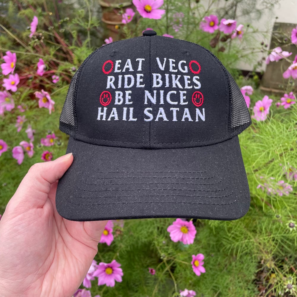 EAT VEG, RIDE BIKES, BE NICE, HAIL SATAN TRUCKER CAP (preorder!)